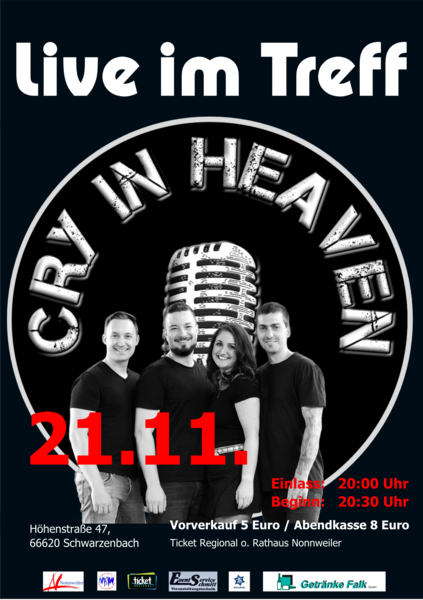Die Saarbrücker Band "Cry in Heaven" begeistert mit einem energiegeladenen Mix aus Rockhymnen und gefühlvollen Popballaden – perfekt für große Bühnen und intime Clubgigs. Frontfrau Adriana verleiht jedem Song mit ihrer wandelbaren Stimme von Soul bis Rock eine unverwechselbare Note. Ob Stadtfest oder Szenekneipe: "Cry in Heaven" liefert ein mitreißendes Live-Erlebnis, das Publikum und Location zu einer Einheit verschmelzen lässt.