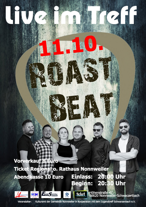 Am 11. Oktober 2025 wird RoastBeat um 20:30 Uhr (Einlass 20:00 Uhr) die Bühne des Jugendtreffs Schwarzenbach rocken und das Publikum mit einer energiegeladenen Show begeistern. Mit Songs, die tief in der Rockgeschichte verwurzelt sind, und einem Sound, der die perfekte Mischung aus Harmonie und Energie darstellt, wird dieser Abend ein Highlight für alle Fans von kraftvollem Rock und authentischen Live-Performances.