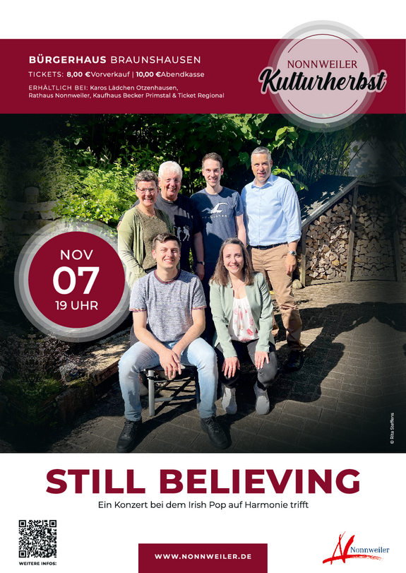 Wer an Irland denkt, hat oft sofort Bilder von sanften Hügeln, lebendigen Pubs und melancholischen Balladen im Kopf. Genau dieses besondere Lebensgefühl bringt die Band Still Believing am Freitag, dem 07.11. 2025, um 19 Uhr (Einlass 18.30 Uhr)ins Bürgerhaus nach Braunshausen.