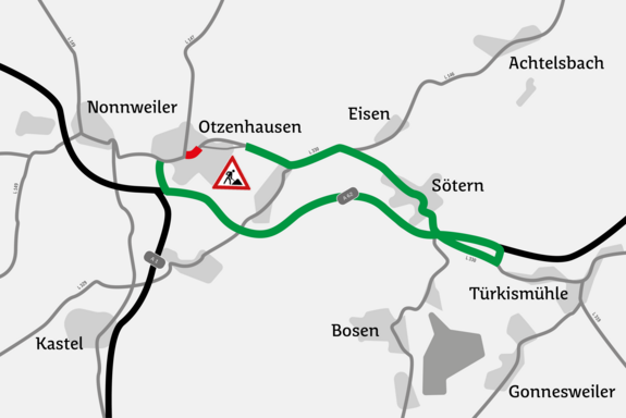 Die Fräs- und Asphaltarbeiten müssen aufgrund der geringen Fahrbahnbreite unter Vollsperrung erfolgen. Die Umleitung führt über die A 1 (Anschlussstelle Otzenhausen bis Anschlussstelle Nohfelden-Türkismühle) sowie die L 330 in Richtung Sötern. Die Gegenrichtung verläuft entsprechend umgekehrt.