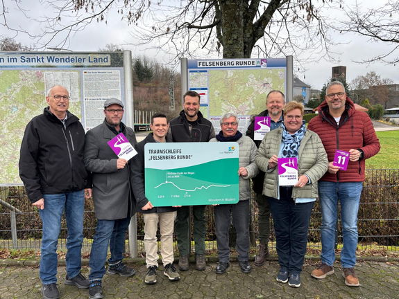 Auf dem Foto v.l.n.r.: Dr. Franz Josef Barth (Bürgermeister Nonnweiler), Alex Marmitt (Ortsvorsteher Wadern-Wadrilltal), Florian Schneider (Tourismus Nonnweiler), Maurice Prüm (Wegewart Wadern), Werner Warken (Wegewart Nonnweiler), Martin Vorreiter (Tourismus Wadern), Lieselene Scherer (Ortsvorsteherin Nonnweiler-Sitzerath), Jochen Kuttler (Bürgermeister Wadern)